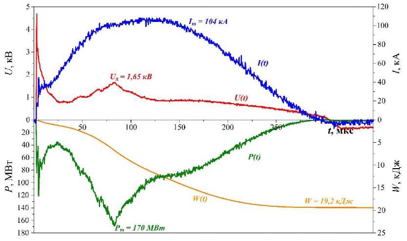 Рис. 1. Осциллограммы рабочего тока I(t) и напряжения U(t) на электродах ускорителя, кривые мощности P(t) и выделившейся энергии W(t)