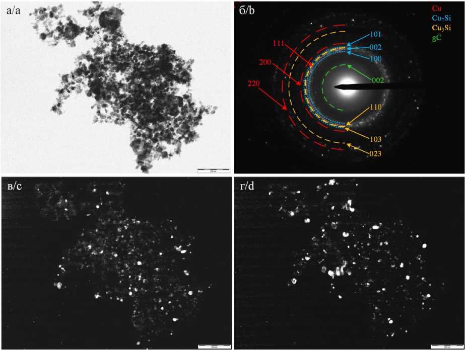 Fig. 3. Transmission electron microscopy results of the synthesized product: а) bright-field TEM image of the cluster; b) electron diffraction pattern on the selected area; c) dark-field photographic images in the light of Cu3Si (023) reflection; d) dark-field photographic images in the light of Cu (220) reflection
