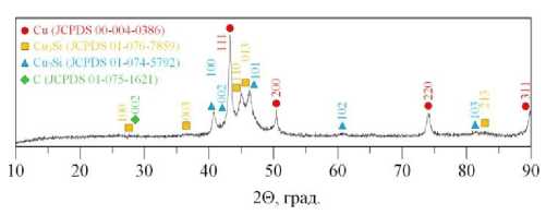 Выводы о полифазном составе синтезированного материала и отсутствии SiC подтверждаются результатами рентгеноструктурного анализа (рис. 4). Наблюдается преимущественное содержание в продукте меди (JCPDS Card No. 00-004-0836, пространственная группа Fm-3m {225}), основные рентгеновские максимумы которой расположены на 2θ=43,3°, 50,5°, 74,1°, 89,9° и отображают кристаллографические плоскости (111), (200), (220), (311) соответственно. Также имеется углерод в виде графита gC (JCPDS Card No. 01-075-1621), пространственная группа P63mc {186}, присутствие которого обусловлено естественной электроэрозией графитовых электродов. Идентифицируются две модификации силицидов меди: Cu3Si (JCPDS Card No. 01-074-5792), пространственная группа P-3m1 {164}), и Cu7Si (JCPDS Card No. 01-075-1621, пространственная группа P63/mmc {194}), которые характеризуются наличием сильно уширенных максимумов интенсивности, что явно свидетельствует о высокодисперсном состоянии синтезируемых частиц.