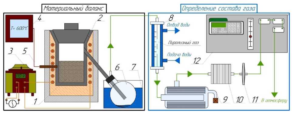 Рис. 1. Лабораторный стенд для определения материального баланса пиролиза и установления состава пиролизного газа: 1 – исследуемое сырье; 2 – реактор; 3 – лабораторный автотрансформатор; 4 – высокоточный многоканальный измеритель температур ТМ 5104 (Элемер, Россия); 5 – термопара ХА; 6 – колба-приемник для летучих продуктов пиролиза; 7 – резервуар с водой для охлаждения; 8 – проточный холодильник; 9 – фильтр со стеклянными трубками; 10 – ватный фильтр; 11 – фильтр из фторопласта; 12 – газоанализатор ТЕСТ-1 (БОНЭР, Россия)