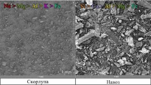 Помимо состава органической составляющей исследуемого сырья важным фактом при термической переработке является распределение компонентов в минеральной части и структура биомассы. Макроструктура исследуемого сырья представлена на рис. 2, из которого следует отметить, что структура СКО является более однородной по сравнению с навозом, структура которого отличается хаотичным распределением разнородных неорганических частиц [38]. Отмечены различия в составе минеральной части исследуемых образцов (рис. 2): в составе растительной биомассы (СКО) преобладают щелочные металлы, такие как натрий и калий, которые являются одними из ключевых питательных веществ, необходимых для роста растений; в биомассе животного происхождения отмечено наличие щелочноземельных металлов, таких как кальций и магний, а также кремния.