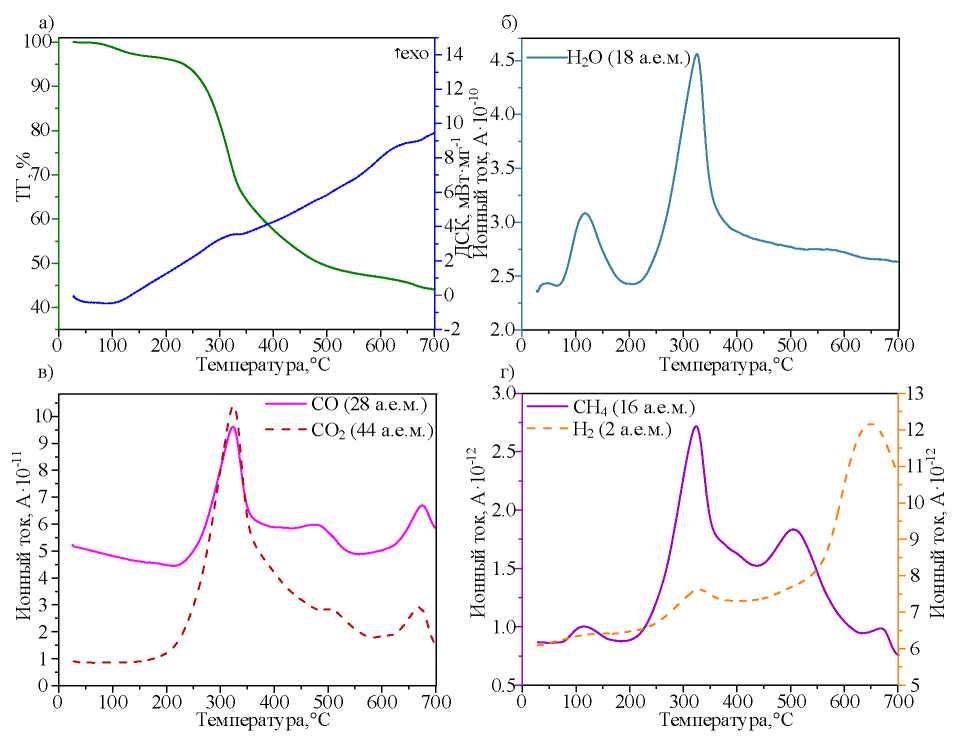 Термический анализ осуществляли с помощью синхронного термоанализатора Netzsch STA 449 F5 Jupiter с интегрированным масс-спектрометром QMS 403 Aeolos. Для анализа использовали образец биомассы, доведенной до воздушно-сухого состояния, массой 5 мг, который равномерно распределяли по дну корундового тигля. Далее систему дегазировали и дважды заполняли аргоном с целью создания инертной атмосферы и исключения влияния окислительных реакций на результаты исследования. Эксперимент проводили следующим образом: образец постепенно нагревали от 30 до 700 °С со скоростью 10 °С/мин в среде аргона со скоростью потока 50 мл/мин. Газообразные продукты деструкции, выделяющиеся из образца, непрерывно транспортировались по трансферной линии, обогреваемой до температуры 235 °С для предотвращения их конденсации, к квадрупольному масс-спектрометру. Детектирование проводили для следующих масс-спектров: 2 (H2), 16 (CH4), 18 (H2О), 28 (СО) и 44 (CO2).