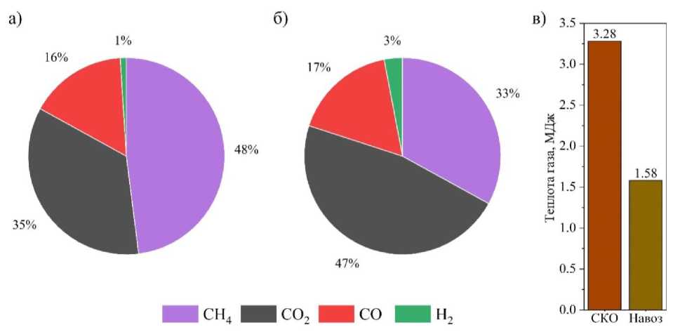 Рис. 6. Состав пиролизного газа СКО (а) и навоза (б); теплота сгорания газообразных продуктов, выделяющихся при переработке 1 кг исследуемого сырья (в)
