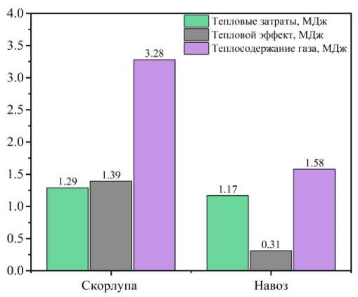 Использование теплоты экзотермических реакций, выделяющейся в ходе разложения сырья, для покрытия тепловых затрат пиролиза позволит добиться снижения количества внешней подведенной энергии для проведения процесса, что положительно скажется на стоимости продукции и, следовательно, ее конкурентоспособности. Для пиролитической переработки требуется подвод тепловой энергии в количестве, необходимом для испарения влаги, содержащейся в сырье, его нагрева до температуры начала активного разложения с последующим термическим преобразованием в конечные продукты. Количество потенциально необходимой энергии рассчитано согласно методике, представленной в [57], и составило 1,29 и 1,17 МДж для пиролиза 1 кг СКО и навоза соответственно (при температуре пиролиза, равной 700 °C). Следует отметить, что для термической переработки отходов животноводства требуется меньшее количество теплоты, чем для пиролиза растительной биомассы (СКО), что связано с высокой зольностью навоза (табл. 1) и, как следствие, меньшим значением теплоемкости [58].