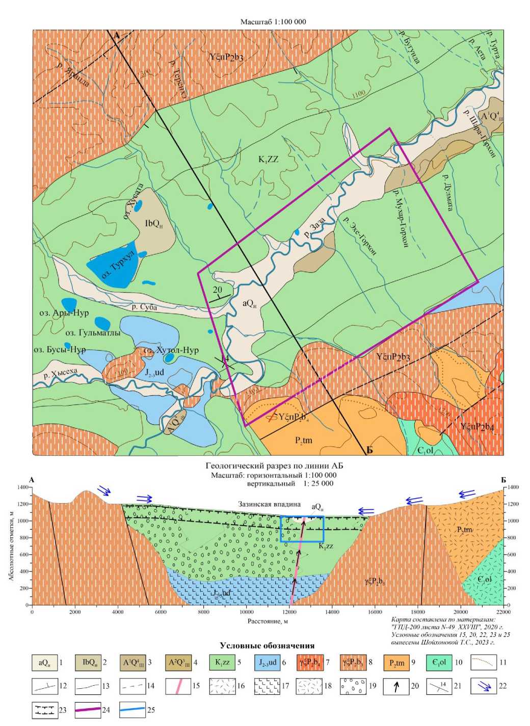 Рис. 1. Геологическое строение участка работ: 1 – аллювиальные (aQH) русловые и пойменные отложения. Галька, пески, валуны; 2 – озерные, озерно-болотные (lbQH) пески, суглинки, глины, илы, торфяники, сапропели; 3 – аллювий первой (a1Q4III) террасы рек. Пески, супеси, галечники, валуны; 4 – аллювий второй (a2Q3III) террасы рек. Пески, супеси, галечники, валуны; 5 – Зазинская свита (К1zz). Песчаники, алевролиты, аргиллиты, битуминозные сланцы, мергели, фосфатно-сидеритовые породы. В прибортовых частях впадины – Ендодинская свита (К1еn). Конгломераты, конглобрекчии, гравелиты; 6 – Удинская свита не расчлененная (J2-3ud). Трахиандезибазальты, трахиандезиты, трахиты, их туфы, ингимбриты, туффиты, гравелиты, песчаники, алевролиты, аргиллиты; Бичурский комплекс габбро-моноцит-гранитовый (7, 8): 7 – четвертая фаза: гранитосиенит-порфиры; 8 – третья фаза (γξP2b3): граниты и лейкограниты умереннощелочного, местами нормального ряда, граносиениты; 9 – Тамирская свита (P2tm). Трахириолиты, трахиродациты, их туфы, туфопесчаники, туфоалевролиты; 10 – Олдындинская свита (Є1ol). Андезиты, андезибазальты, дациты, риолиты, трахибазальты и их туфы, песчаники, алевролиты, известняки; 11 – зона контактовых роговиков, мощность которой не выдерживается в масштабе карты; Разрывные нарушения (12–15): 12 – сбросы главные достоверные; 13 – второстепенные достоверные; 14 – второстепенные предполагаемые; 15 – разломная зона; литология (16–19): 16 – трахириолиты; 17 – трахиандезибазальты, трахибазальты; 18 – риолиты; 19 – конгломераты; прочие обозначения (20–25): 20 – тепловой поток; 21 – наклонное залегание слоистости (цифра – угол падения); 22 – региональный сток из кристаллических пород горного обрамления; 23 – зона многолетнемерзлых пород; 24 – граница лицензионного участка; 25 – контур для построения упрощенных геологических моделей