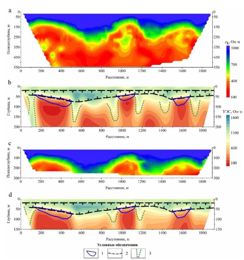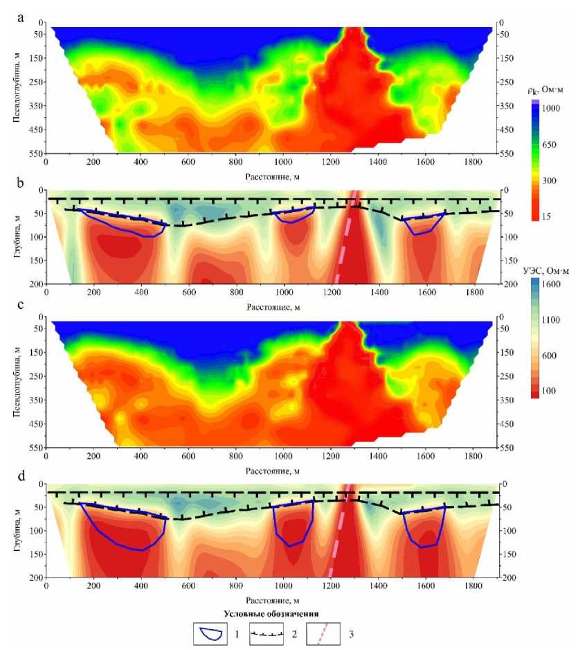 Рис. 5. Результаты решения прямой и обратной задачи электроразведки для трехэлектродной установки с шагом 5 м (а и b соответственно) и 10 м (c и d соответственно) для модели А: 1 – контур таликовых зон; 2 – зона ММП; 3 – высокоомные субвертикальные структуры, оконтуривающие таликовые зоны