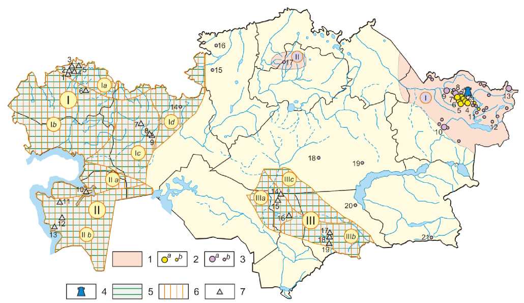 Fig. 1. Lithium mineral raw materials of the Republic of Kazakhstan: 1–3 – ore lithium mineralization: 1 – rare metal provin-ces (I – Irtysh, II – Kokchetav), 2 – deposits (a) and manifestations (b) of spodumene pegmatites (1 – Bakennoe, 2 – Yubileynoe, 3 – Verkhne-Baymurzinskoe, 4 – Belaya Gora, 5 – Ognevskoe, 6 – Akhmetkino, 7 – Tochka), 3 – deposits (a) and manifestations (b) of rare-metal greisen-hydrothermalite formations (8 – Novo-Akhmirovskoe, 9 – Kvartsevoe, 10 – Verkhnee Espe, 11 – Cherdayak, 12 – Karasu, 13 – Kokkol, 14 – Verkhne-Irgizskoe, 15 – Drozhzhilovskoe, 16 – Smirnovskoe, 17 – Totoguz, 18 – Karaobinskoe, 19 – Zhanet, 20 – Maykol, 21 – Karagailyaktas); 4 – enterprise for processing rare metal raw materials – Ulba Metallurgical Plant, 5–7 – hydromineral raw materials of near-oil waters: 5 – oil and gas provinces (I – Caspian, II – Mangystau-Ustyurt, III – Shu-Sarsu), 6 – oil and gas regions (Ia – North Caspian, Ib – East Caspian, Ic – East-Emben, Id – Aktobe-Priuralskaya, IIa – Buzachin-North-Ustyurt, IIb – South-Mangystau-Ustyurt, IIIa – Kokpansor, IIIb – Moyinkum, IIIc – Tesbulak), 7 – oil and gas fields with lithium-bearing formation waters (1 – Tokarevskoe, 2 – Tsyganovskoe, 3 – Ulyanovskoe, 4 – Gremyachinskoe, 5 – Teplovskoe, 6 – Karachaganak, 7 – Urikhtau, 8 – Kenkiyak, 9 – Zhanazhol, 10 – Komsomolskoe, 11 – Ozen, 12 – Asar, 13 – Bekturly, 14 – Ortalyk, 15 – West Opak, 16 – Pridorozhnoe, 17 – Kolkuduk, 18 – Airakty, 19 – Amangeldy)