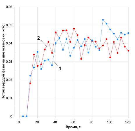 Рис. 3. Массовый расход твёрдой фазы на дне установки: 1 – сток 0,1 кг/с; 2 – сток 1 кг/с