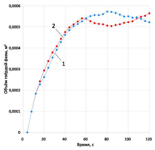 Для обоих случаев графики являются практически прямыми наклонными линиями, что соответствует дрейфу расхода возле постоянного значения. Накопление в толще жидкости распределённой твёрдой фазы также происходит стадийно. Из рис. 5 видно, что до момента времени θ=44 с объём твёрдых частиц демонстрирует замедляющийся рост, а после указанного момента наблюдается выход на плато в области значений 5,5×10–4 м3. Причём описанная картина наблюдается для обоих расчётных случаев.