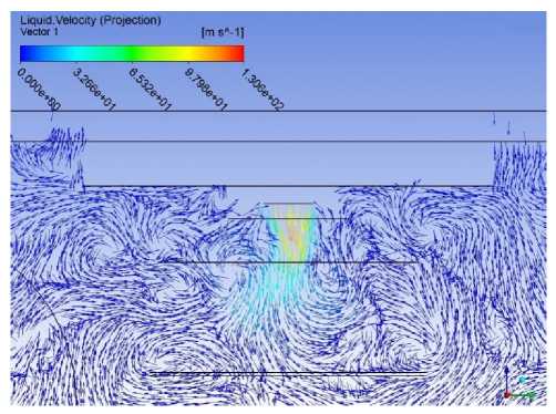 Рис. 8. Скорость жидкости в области возле погружной горелки (θ=120 с)