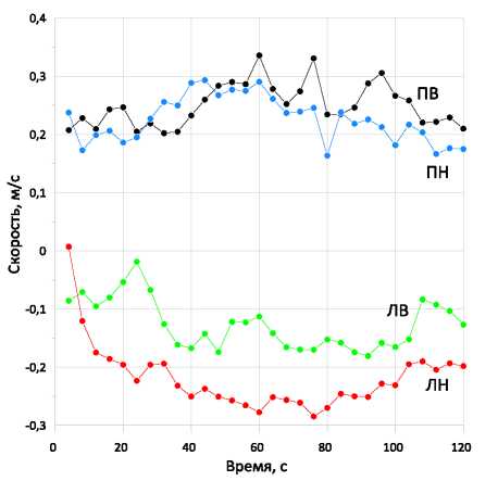 Fig. 12. Projections of liquid velocities on the Y-axis: ПН – lower right point; ЛН – lower left point; ЛВ – upper left point; ПВ – upper right point