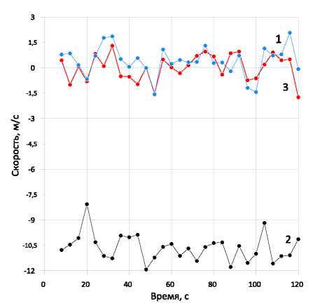 Рис. 14. Скорость газа на кончике струи: 1–3 – X, Y и Z-компоненты, соответственно