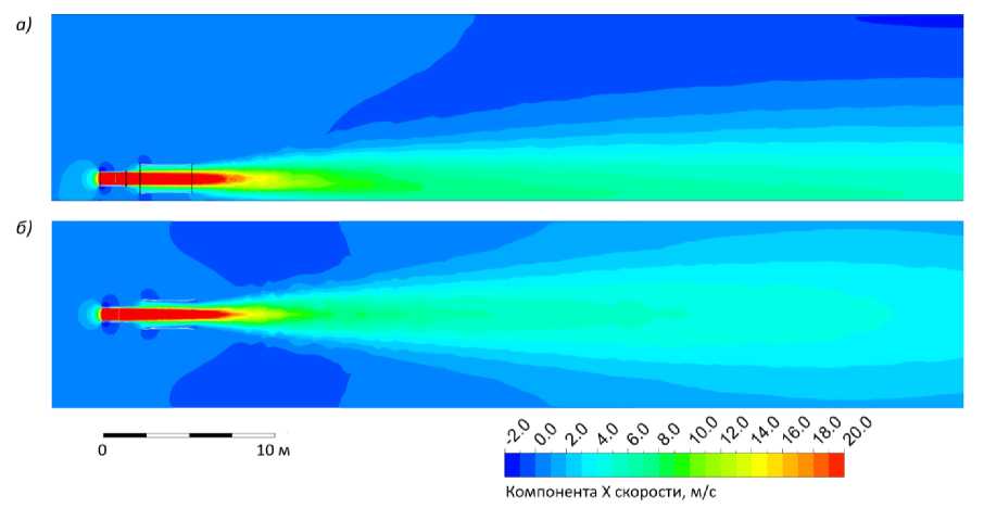 Рис. 3. Распределение продольной компоненты скорости потока в вертикальном сечении, проходящем через ось вентилятора: а) вентилятор на почве выработки; б) вентилятор на середине высоты выработки