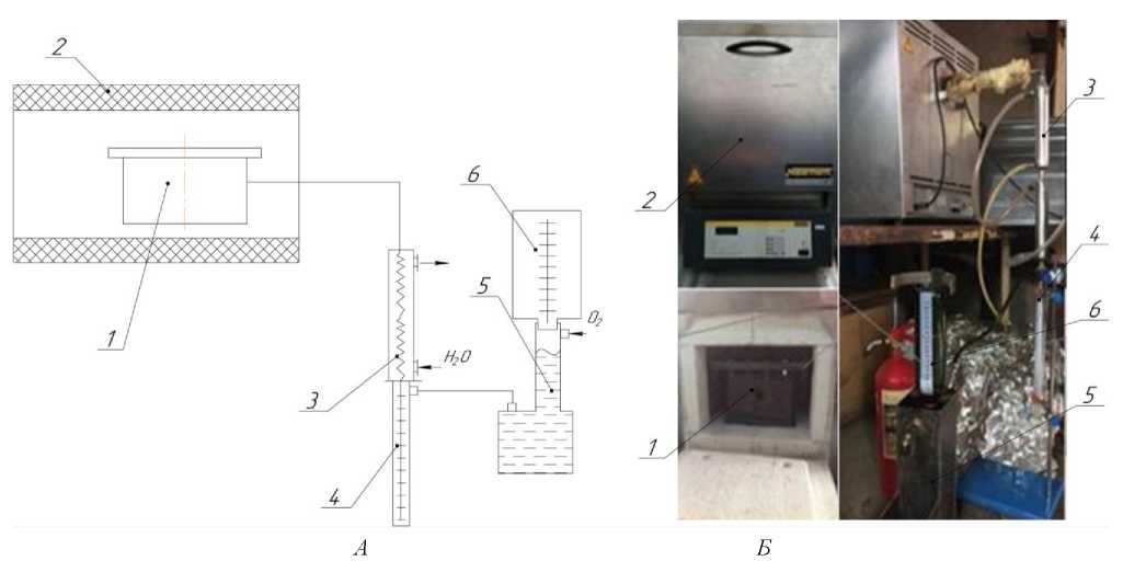 Fig. 1. Scheme (А) and external view (Б) of the experimental setup for pyrogenetic processing of plant waste: 1 – pyrolysis chamber; 2 – muffle furnace; 3 – separator; 4 – distillate dipstick; 5 – water seal; 6 – gas collector