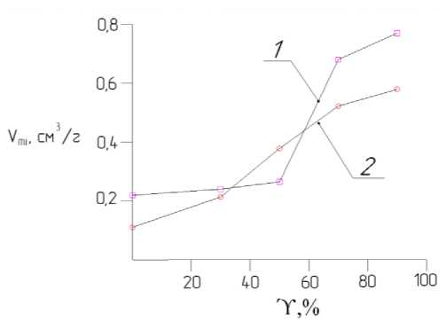 Fig. 5. Dynamics of formation of micropores in activated carbons depending on the degree of burnout of the initial carbonization products: 1 – compacted granular plant material; 2 – hard coal