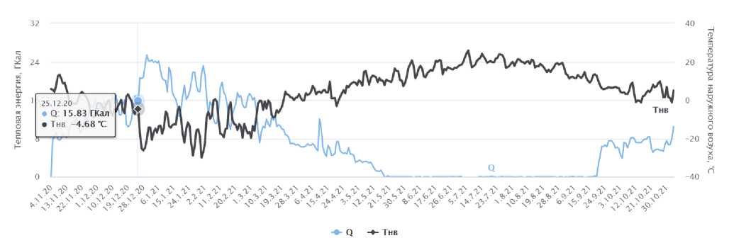 Для примера рассмотрим данные независимой закрытой системы теплопотребления здания за год. График суточного теплового потребления Q рассматриваемой системы здания совместно с среднесуточной температурой наружного воздуха Тнв представлен на рис. 1.