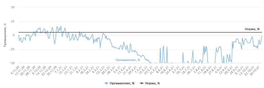 В соответствии с правилами технической эксплуатации тепловых энергоустановок среднесуточная температура обратной сетевой воды не должна превышать заданную температурным графиком температуру более чем на 5 %. На рис. 3 представлен график превышения температур теплоносителя обратного трубопровода заданной системы, из которого видно, что за выбранный период наблюдалось нарушение температурного режима.