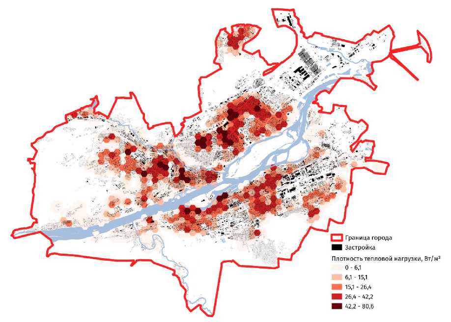 Картосхемы распределения тепловой нагрузки и плотности тепловой нагрузки демонстрируют, что наибольшая удельная тепловая нагрузка приходится на новые жилые районы высотного домостроения.