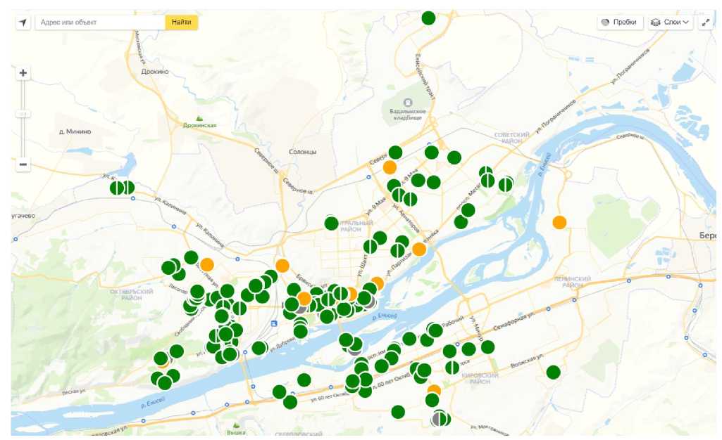 Система мониторинга используется для значительного количества зданий, для которых рассчитывается показатель относительного удельного теплопотребления с выводом на GIS-систему в реальном времени. На рис. 11 показано представление показателя относительного удельного теплопотребления для зданий г. Красноярска. Зеленым отмечены здания, где показатель относительного удельного теплопотребления не превышает порог низкой энергоэффективности, желтым – где превышает на данный момент.