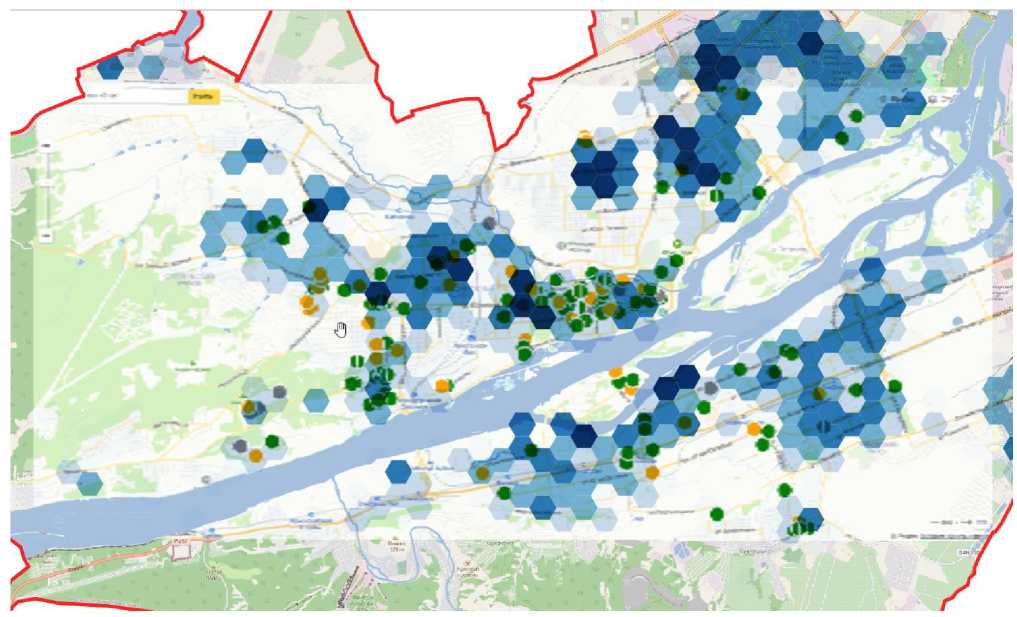 В результате выполненного геокодирования данные были нанесены на картографическую основу и выполнено пространственное пересечение со слоем гексагонной сетки. Выполнены следующие расчеты: удельная тепловая нагрузка, показанная на рис. 9, удельная годовая потребность в теплоте, удельная энергоэффективность зданий, а также получено распределение систем теплоснабжения, представленное на рис. 10.
