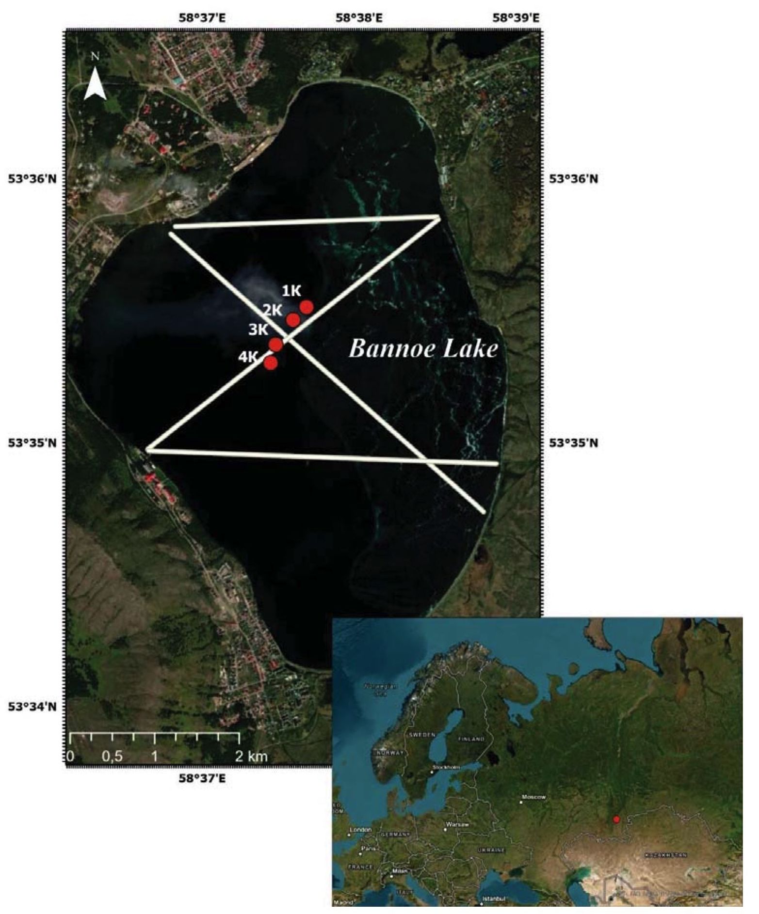 Lake Bannoe (53°35'48.13”N 58°37'47.28”E) is located in the Southern Urals (Fig. 1). The altitude of the lake is 434 m, the width is ~1.9 km, the length is ~4.2 km, and the basin area is 36.3 km2. The lake is of tectonic origin [10].