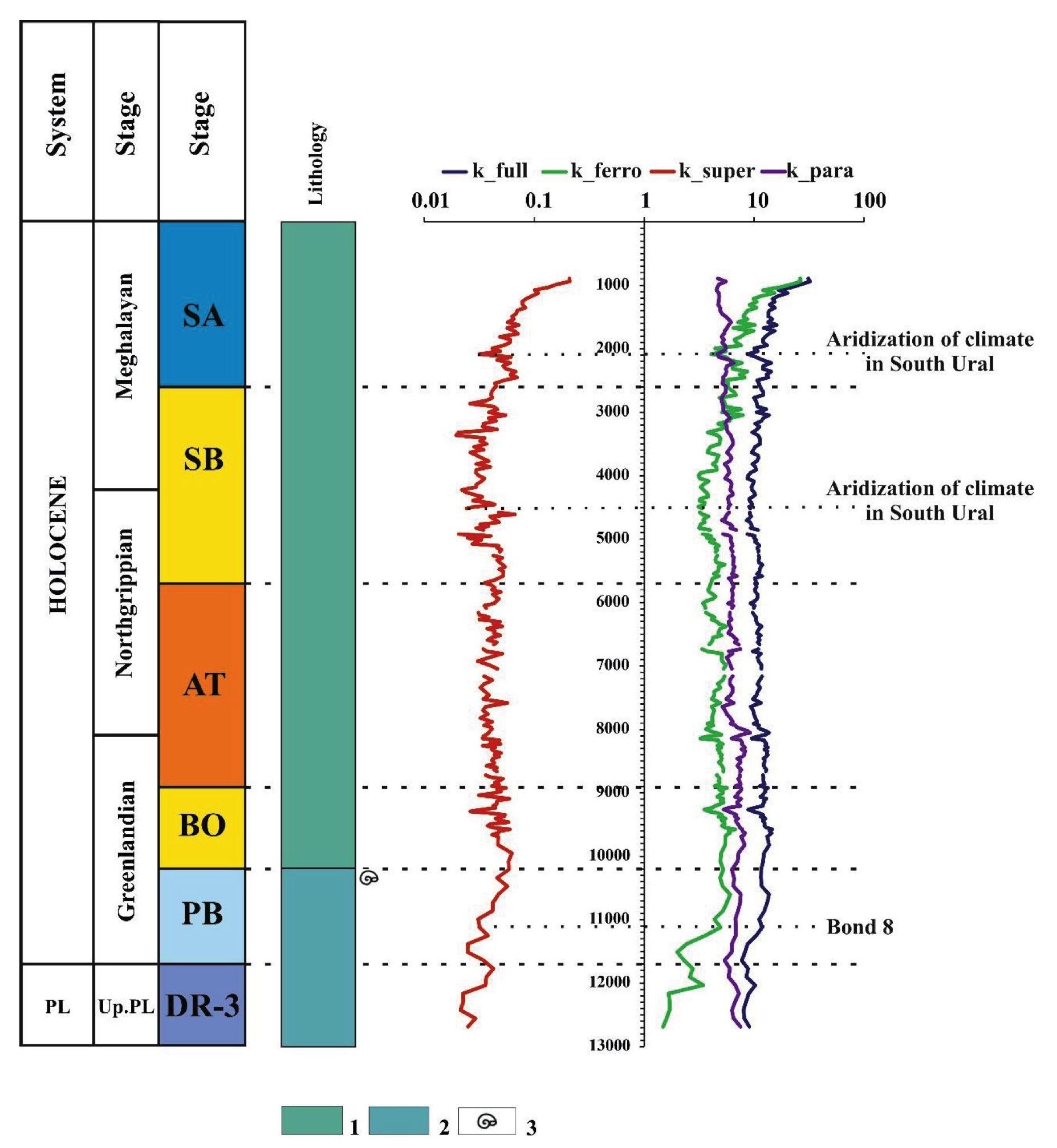 The Preboreal is known for significant climate warming and rise in the world sea level [23]. This stage is also characterized by increased MS, k_para, k_ferro, and k_super components. An increase in the values indicates a transition from cold and dry climate of the Late Pleistocene to warm and humid conditions of the Holocene [4]. The Bond global event [24] synchronized with an increase in k_ferro values (Fig. 4) due to allothigenic and authigenic sedimentary material filling the newly formed lake basin.