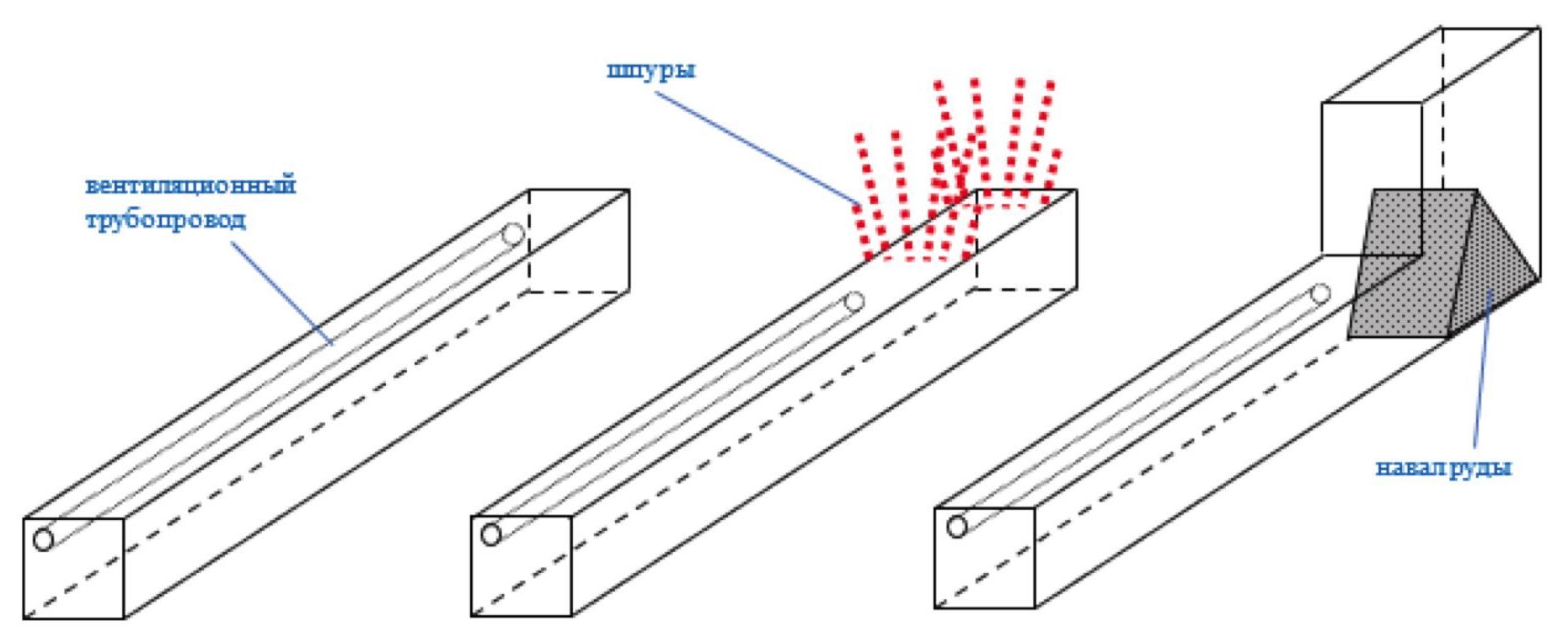 Вследствие взрыва в камерном пространстве образуется навал руды, который может разделять проветриваемый объем камеры на два с точки зрения проветривания. Первый – активно проветривающийся объем до навала руды за счет кинетической энергии воздушной струи, бьющей из конца вентиляционного трубопровода. Второй – объем за навалом руды, проветривающийся преимущественно за счет турбулентной диффузии и локальных конвективных вихрей, формирующихся в застойных зонах воздушного пространства камеры.