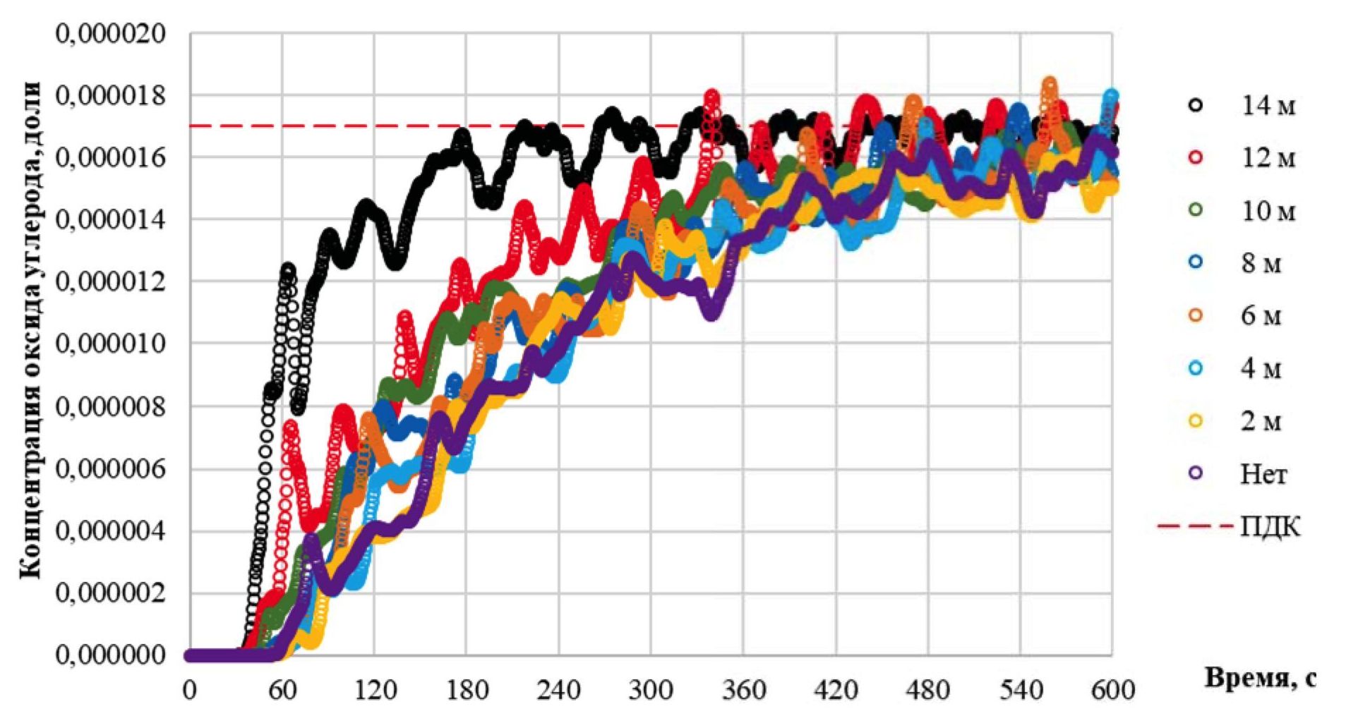 Источник газовыделения представлен сферой диаметром 1 м с целью упрощения расчета. В качестве газа выбран оксид углерода (CO). Скорость движения газовоздушной смеси соответствует выделению 0,23 кг/с газа. Концентрация газа при этом соответствует 75, 100 и 125 предельно‑допустимым концентрациям (в первом, втором и третьем случаях соответственно).