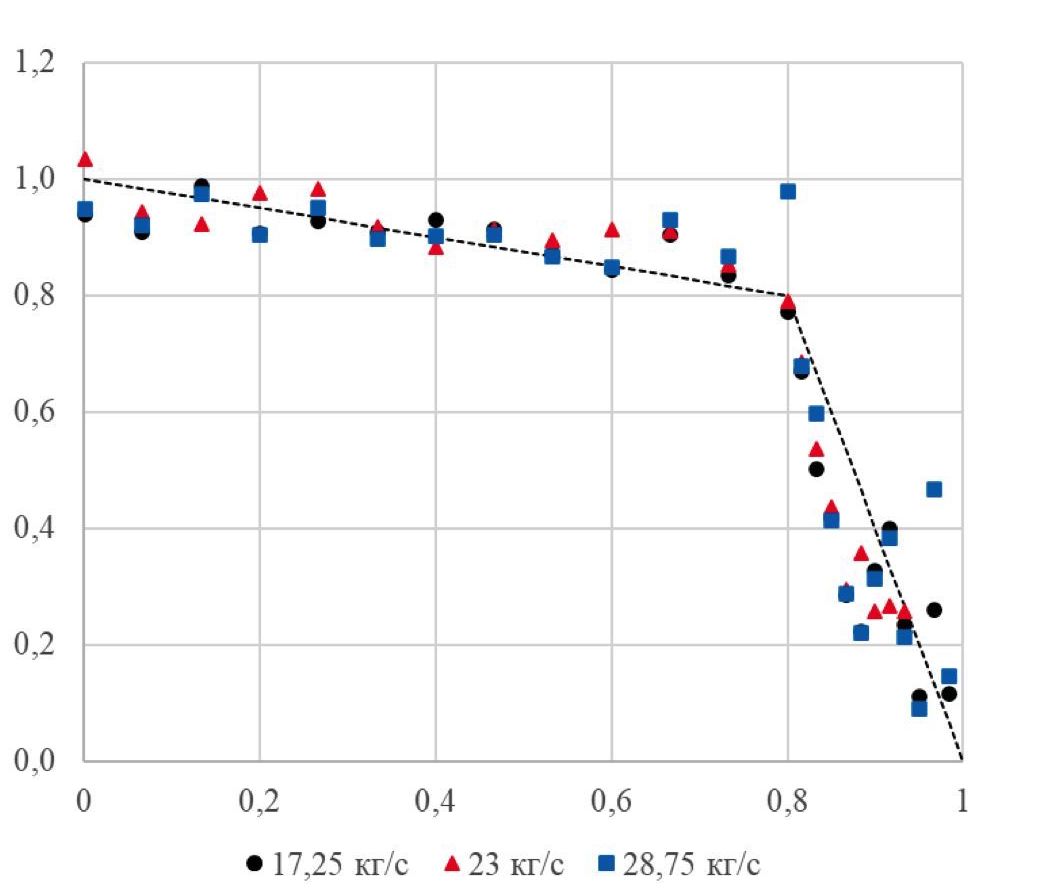 По результатам аппроксимации полученных значений средней концентрации газа на выходе из разрезной выработки для различных высот навала руды и различных массовых расходов воздуха из вентиляционного трубопровода значение поправочного объемного коэффициента лежит в пределах от 0,1 до 1. Как видно из рис. 5, при соотношении высоты навала к общей высоте камеры от 0 до 0,8 значение поправочного объемного коэффициента находится в пределах 0,8…1. При соотношении выше 0,8 значение поправочного объемного коэффициента резко снижается. Это связано с уменьшением фактического объема проветривания ввиду условного разделения камерного пространства на два принципиально различных с точки зрения проветривания объема (рис. 3).