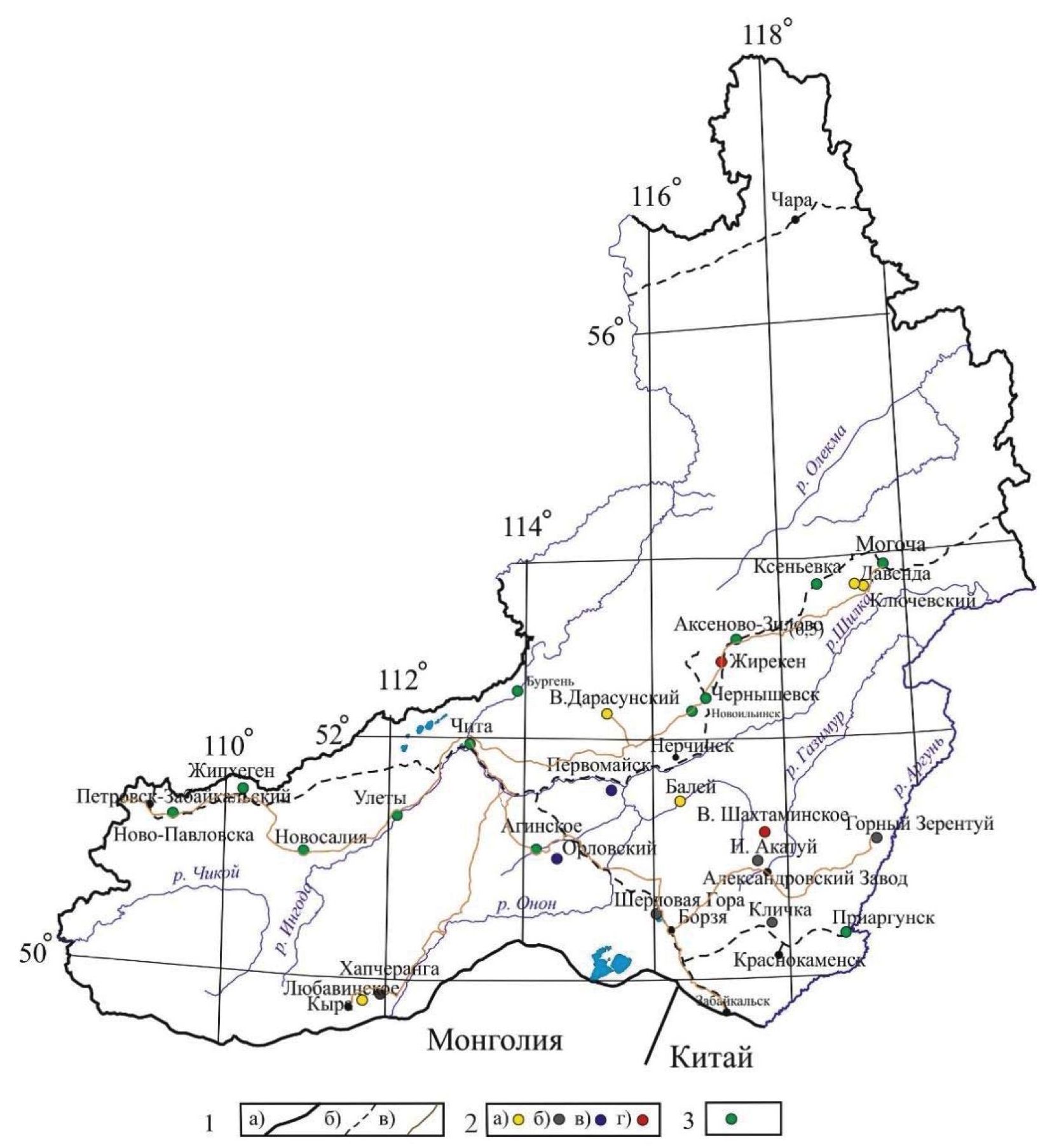 Figure. Scheme of testing residential soils of Eastern Transbaikalia 1 – a) administrative and state borders; б) railways; в) highways; 2 – settlements of mining districts with deposits: a) gold; б) lead, zinc, tin; в) rare metals; г) molybdenum; 3 – settlements not related to mining activities