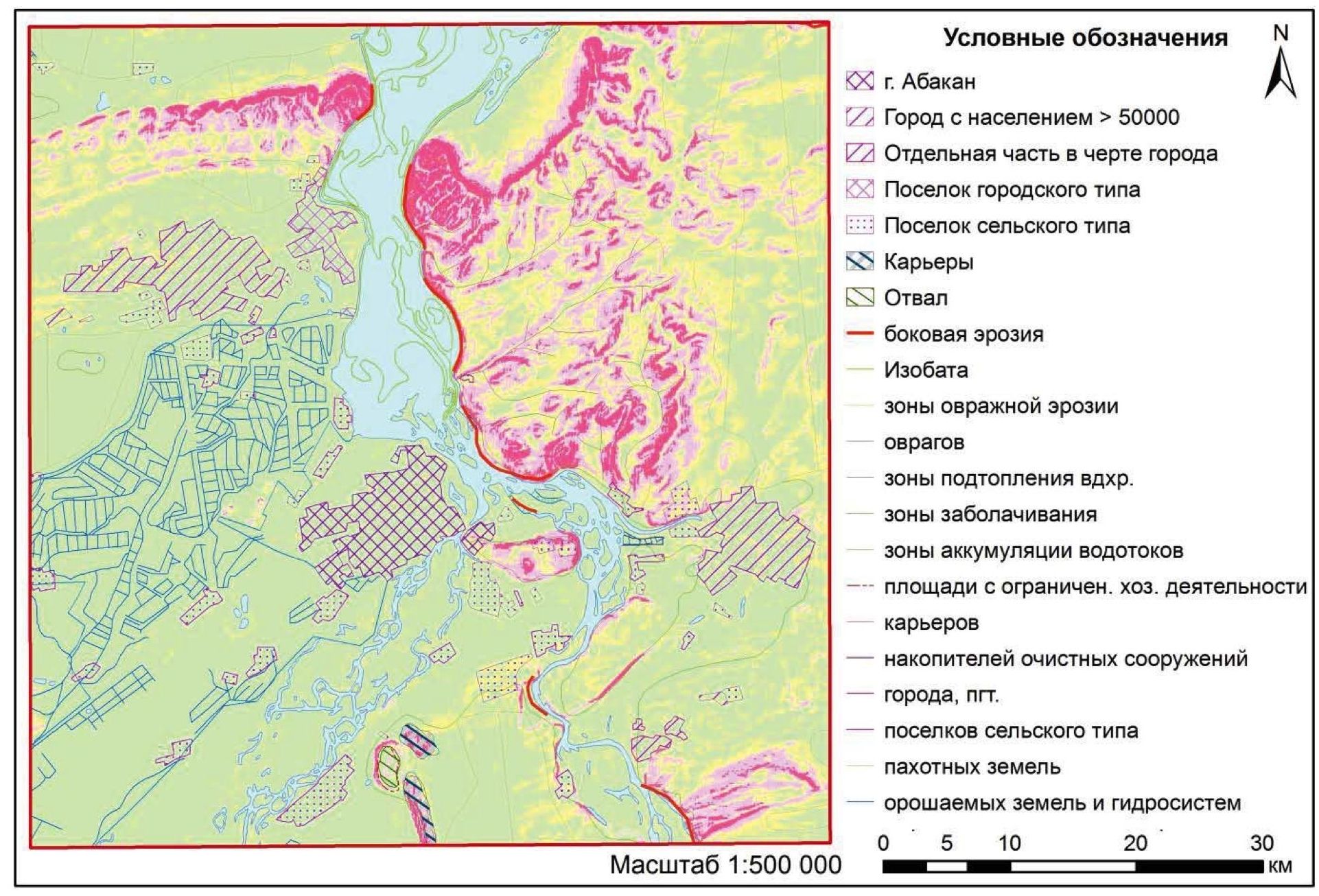 Проведенный анализ литературных и фондовых материалов позволил установить, что для территории характерны гравитационно-эрозионные, оползневые процессы и процессы подтопления. Так, процессы гравитационно-эрозионного комплекса развиваются в береговых зонах рек и водохранилищ. Оползневые процессы встречаются в Алтайском, Боградском и Усть-Абаканском районах. Процессам подтопления подвергаются около 30 населенных пунктов, расположенных в степных и предгорных районах. В их число входят гг. Абакан, Черногорск, Минусинск, пгт. Усть-Абакан, сельские населенные пункты Алтайского, Аскизского, Бейского и Таштыпского районов. Практически вся территория г. Абакана находится в зоне подпора грунтовых вод, развитой в связи с заполнением Красноярского водохранилища. Подтоплению подвержены как старые районы города, так и вновь застраиваемые районы.