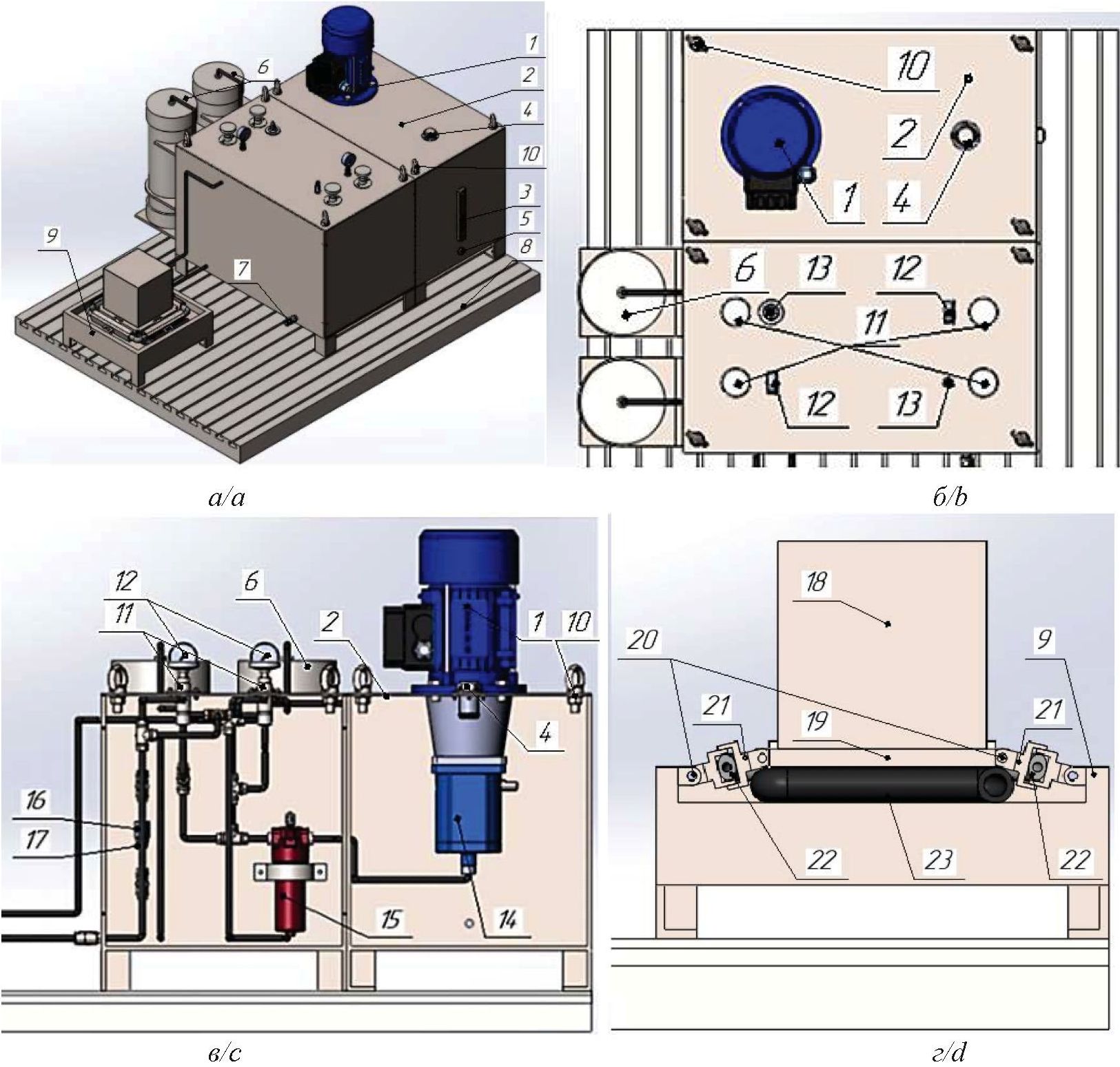 Fig. 8. 3D model of the device: a) general view of the vibration protection system with quasi-zero stiffness; b) top view of the control system; c) view from inside the control system; d) sectional view of a vibration damper with quasi-zero stiffness; 1 – electric motor; 2 – housing of the hydraulic pumping station; 3 – oil indicator; 4 – stopper of an oil jellied mouth; 5 – drain plug; 6 – hydropneumatic accumulator; 7 – check valve; 8 – base; 9 – vibration damper body; 10 – eye bolts; 11 – valve; 12 – manometer; 13 – safety valve; 14 – axial piston pump; 15 – filter; 16 – throttle; 17 – check valve; 18 – intermediate mass; 19 – shelf; 20 – hinges; 21 – glasses; 22, 23 – hoses