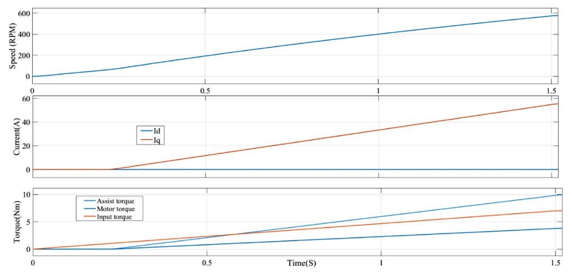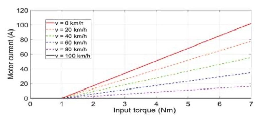 В качестве примера авторы исследовали спроектированный электродвигатель для ЭУР ТС массой 5 т. Когда скорость равна нулю, максимальный вспомогательный ток исследуемой системы ЭУР был равен 102 А, поэтому первый коэффициент a (14) можно рассчитать при максимальном крутящем моменте водителя следующим образом: