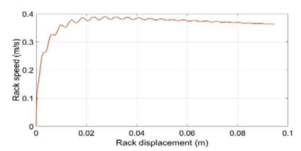 На рис. 13 показано смещение рейки от центрального положения до точки остановки. Скорость рейки имеет значение 0,37 м/с для поворота колес при входном крутящем моменте водителя, равном 7 Нм, с эквивалентной силой, равной 11 кН.
