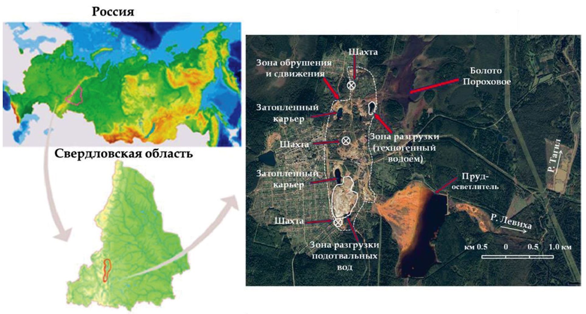 Месторождения открыты в 20-х гг. прошлого века. Эксплуатация проводилась как открытым, так и подземным способом. С 2003 г. началось затопление горных выработок [9]. К 2007 г. на северном фланге рудника в провале глубиной около 20 м (в наиболее низкой точке горного отвода) сформировался техногенный водоем, куда разгружаются минерализованные кислые шахтные воды (КШВ) с расходом порядка 120 м3/ч [10].