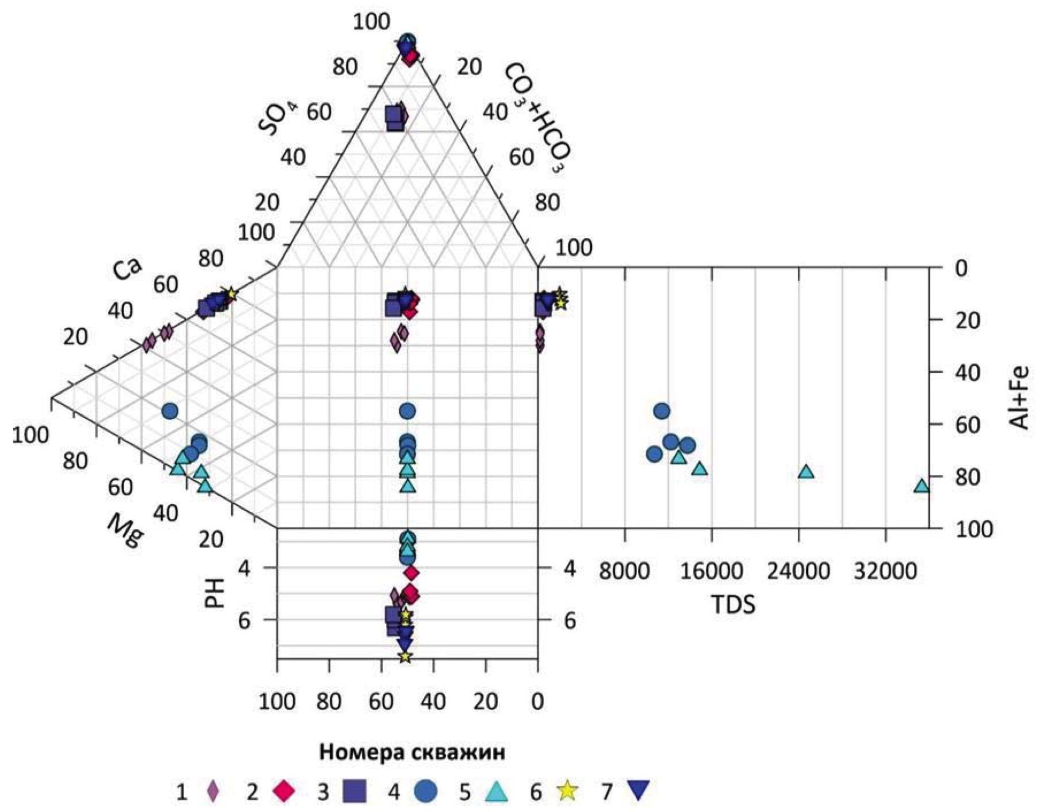 Анионный состав подземной воды сульфатный, катионный состав магниево-кальциевый либо железо-алюминиевый. Исключение составляют скважины № 1, 3, 7. В скважинах № 1, 3 вода имеет гидрокарбонатно-хлоридно-сульфатный состав; по катионам вода натриево-кальциево-магниевая и магниево-кальциевая. В скважине № 7 вода имеет гидрокарбонатно-сульфатный состав; по катионам вода магниево-кальциевая. В скважинах № 1, 2, 3, 6 воды слабокислые (рН от 5,0 до 6,4). В скважинах № 4 и 5 воды кислые (рН от 2,8 до 3,5). Фактические величины рН имеют нейтральные значения в скважине № 7 (до 7,0). Воды в скважинах № 2, 4, 5 находятся в окислительной обстановке (значения Еh>+100 мВ), в воде присутствует свободный кислород, элементы мигрируют в высшей форме своей валентности. Воды в остальных скважинах находятся в условиях переходной окислительно-восстановительной обстановки: величины Еh изменяются от 0 до +100 мВ, в условиях неустойчивого геохимического режима, когда протекает как слабое окисление, так и слабое восстановление целого ряда металлов (табл. 1, рис. 2, 3).