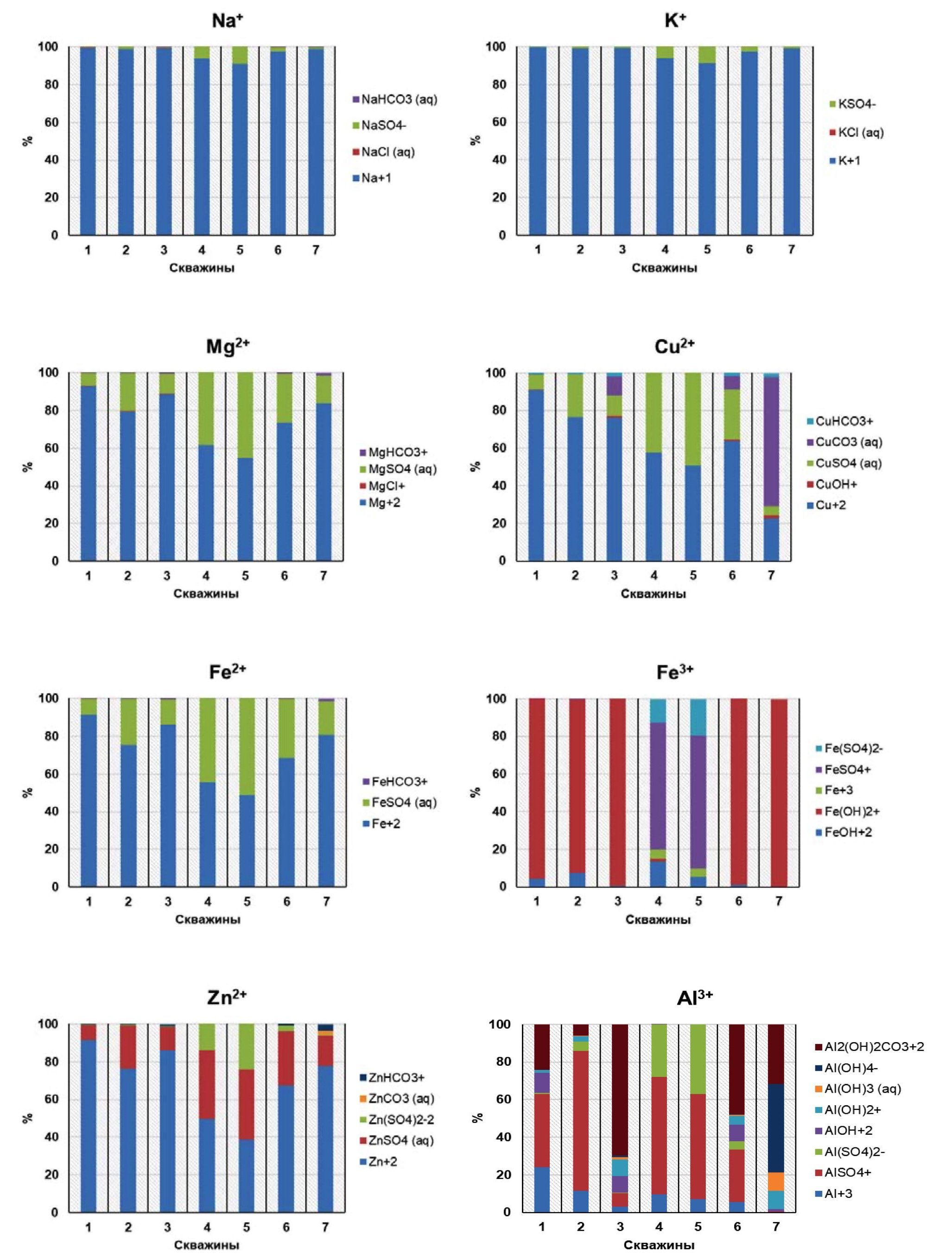 Основные химические формы миграции элементов в подземных водах зависят от их валентности. Так, по данным термодинамических расчетов, однозарядные катионы (натрий и калий) мигрируют преимущественно в виде свободных ионов (в среднем более 95 %) (рис. 5). Двухзарядные катионы (кальций, магний, марганец, цинк) мигрируют в ионно-растворенной форме (более 55 %), реже в форме сульфатных комплексов.