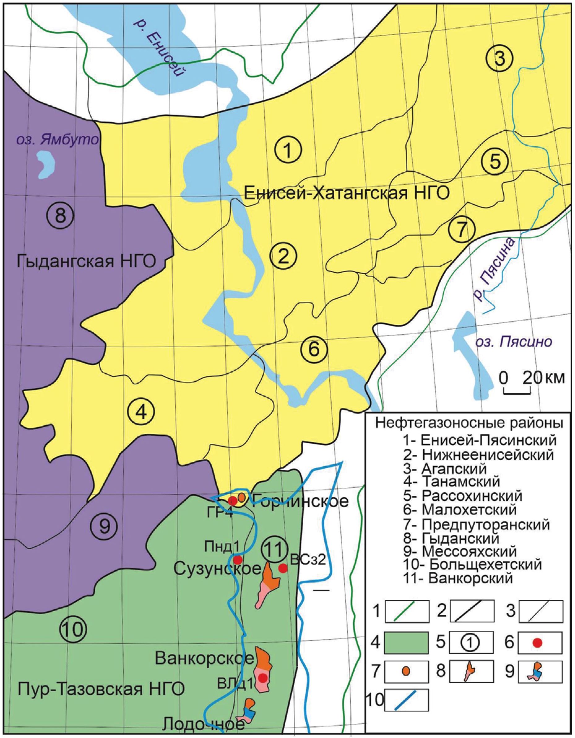 Рис. 1. Схема нефтегазогеологического районирования исследуемой территории [5–7]: 1 – границы перспективных земель; 2 – границы нефтегазоносной области (НГО); 3 – границы нефтегазоносных районов (НГР); 4 – окрас НГО; 5 – номера НГР; 6 – изученные скважины: ГР4 – Горчинская 4, ВСз2 – Восточно-Сузунская 2, Пнд1 – Пендомаяхская 1 и ВЛд1 – Восточно-лодочная 1, 7–9 – месторождения УВ: газовые (7), газо-нефтяные (8) и нефтегазоконденсатные (9); 10 – граница Большехетской структурной террассы
