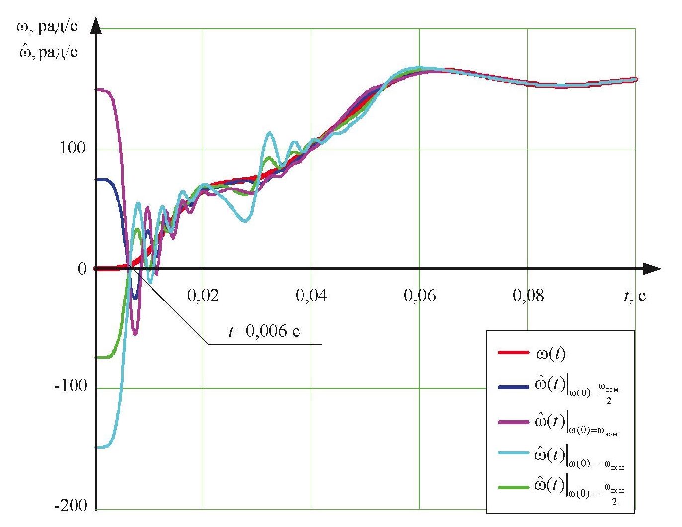 Одним из важных показателей устойчивости разработанного наблюдателя является способность отработки несогласованности начальных условий наблюдателя и реального процесса. Результаты моделирования угловой скорости ротора погружного электродвигателя в режиме пуска и оценок наблюдателя при несогласованности начальных условий приведены на рис. 2.