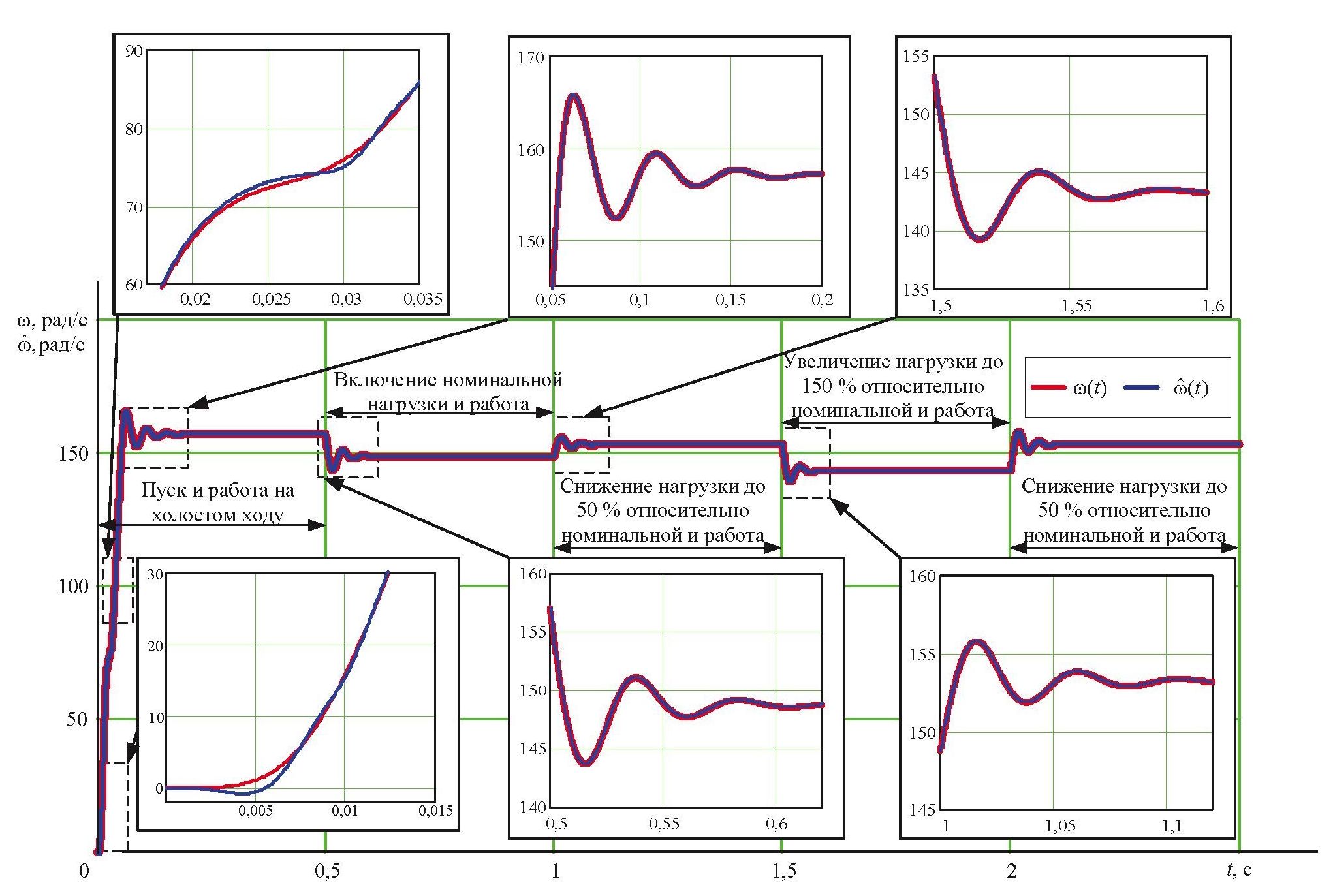 Рис. 3. Переходные характеристики угловой скорости ротора погружного электродвигателя ω(t) и ее оценок с помощью наблюдателя (t)при изменяющейся нагрузке на валу