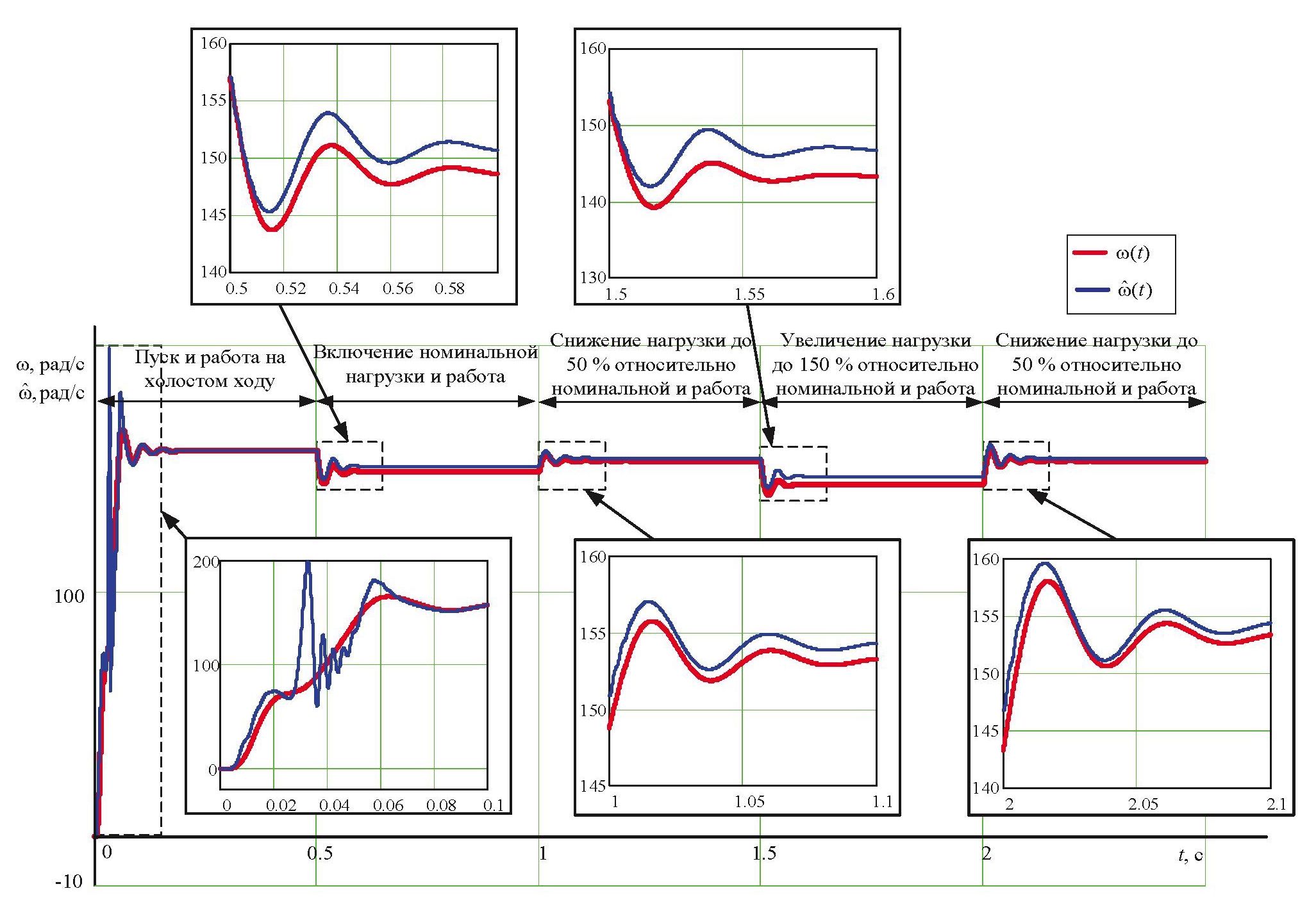4. Проведена проверка работоспособности и эффективности наблюдателя при отработке изменяющейся нагрузки на валу двигателя. Выявлено, что разработанный наблюдатель при изменении нагрузки на валу, перегрузке и пуске в нагруженном состоянии получает устойчивые оценки угловой скорости ротора и момента сопротивления на валу погружного асинхронного двигателя. Интегральная погрешность оценки угловой скорости ротора относительно значений, полученных с помощью модели, составляет не более 1,2 %, что допустимо в системах управления погружными электродвигателями.