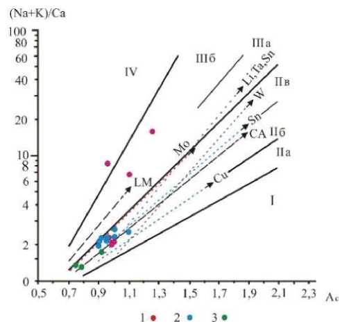 Fig. 3. Diagram (Na+K)/Ca–Ac for igneous rocks of the Amazarkan deposit according to [17]. Amudzikan complex: 1 – granodiorites, 2 – diorites, 3 – gabbroids. Classification fields of rocks: I – calcareous, II – calc-alkaline (IIa – subcalcic, II6 – calc-alkaline, IIb – subcalc-alkaline granites); III – subalkaline (IIIa – subalkaline and alkaline granites and leucogranites, IIIb – alkaline agpaitic granites); IV – alkaline. Reference trends (dash-dotted lines): CA – main calc-alkaline, LM – latite (monzonite), Sn – tin, Cu – porphyry copper, Mo-(Cu) – molybdenum, W-(Mo) – tungsten-molybdenum; Li, Ta, Nb, Sn – lithium-tantalum-niobium-tin