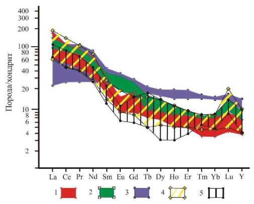 Рис. 4. Спайдер-диаграмма распределения редкоземельных элементов в породах и рудах Амазарканского месторождения. Поля на диаграмме: амуджиканский интрузивный комплекс (J2-3): 1 – гранодиориты, 2 – диориты; 3 – базальты нюкжинской серии (J3); рудоносные жилы: 4 – сульфидно-кварцевые, 5 – сульфидно-кварцевые с включениями графита