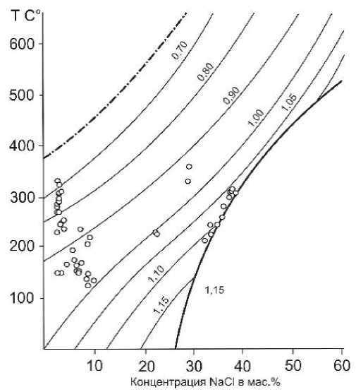 Рис. 7. Диаграмма состояния водно-солевой системы NaCl–H2O насыщенных паром растворов H2O-NaCl по [10, 11]. Штрих-пунктирная линия – кривая равновесия «пар–жидкость»; жирная сплошная линия – кривая равновесия «жидкость–галит»; тонкие сплошные линии – изохоры, указана плотность (г/см3). Показаны температура гомогенизации и соленость ФВ в кварце рудных жил Амазарканского месторождения