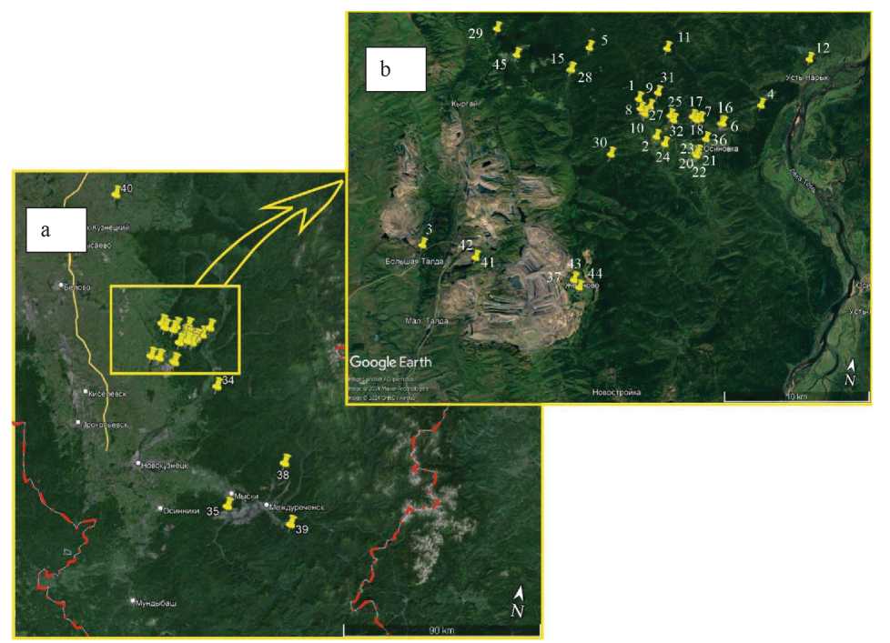 Fig. 1. Scheme of sampling points in Kuzbass (а), on the Naryksko-Ostashkinskaya and Taldinskaya areas (b)