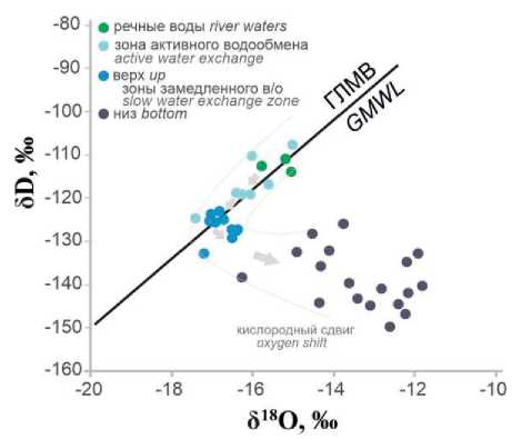 Камеральная обработка заключалась в нанесении фигуративных точек с данными на диаграмму δD–δ18О, где они сравнивались с глобальной линией метеорных вод (ГЛМВ, в английском варианте GMWL – Global Meteoric Water Line) [33], на основе чего делался вывод о генезисе самого растворителя. Уравнение для линии ГЛМВ следующее: