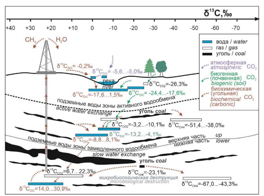 - Составлена схема эволюции изотопного состава водорастворенного углерода в регионе. Несмотря на широкий диапазон значений δ13СDIC, в подземных водах присутствует только биогенная углекислота, а точнее легкая почвенная (от –17 ‰ и легче) и тяжелая биохимическая (положительные значения δ13С), связанная с процессом метанообразования в угольном пласте. Все многообразие δ13СDIC связано с разной степенью участия данных СО2. В целом с глубиной δ13СDIC утяжеляется. В речных водах преобладает атмосферный источник СО2.