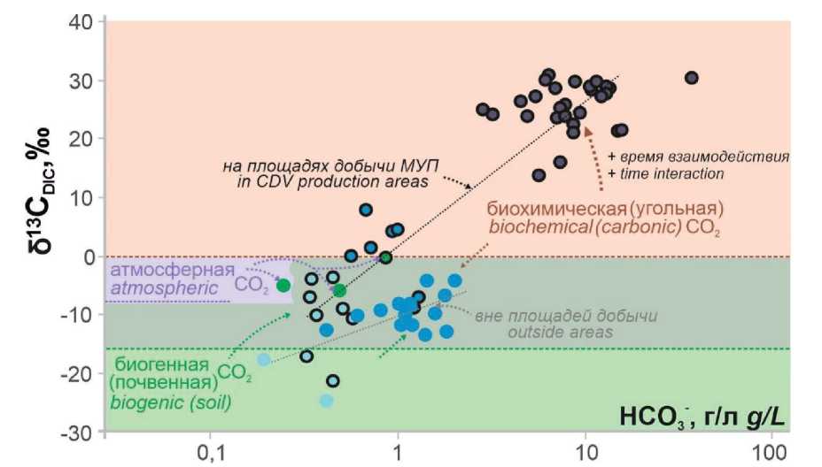 Непонятным остается вопрос о поступлении тяжелого углерода из зоны замедленного водообмена в вышезалегающие воды. Такая тенденция существует на территории добычи МУП и угольных разрезов (рис. 5). В реке Талде установлен содовый состав воды с превышением значений минерализации в 6 раз и утяжелением δ13CDIC на 5 ‰ по сравнению с другими реками. Очевидно, сюда стекает минерализованная вода с угольного разреза. Поступление тяжелого гидрокарбонат-иона в зону активного водообмена вызывает много вопросов. Имеет это природную или техногенную причину необходимо выяснять далее.