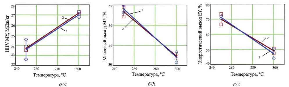 Рис. 1. Зависимость высшей теплоты сгорания (а), массового выхода (б) и энергетического выхода (в) от температуры и времени выдержки: 1 – 60 минут; 2 – 30 минут