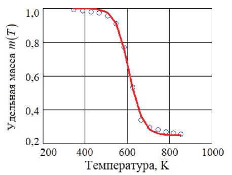 Рис. 8. Температурные зависимости удельной массы пиролизуемой пеллеты по данным ТГА, полученным авторами: кривая – расчетная зависимость с параметрами A и E (23); кружки – экспериментальные точки, снятые с кривой ТГА (рис. 2)